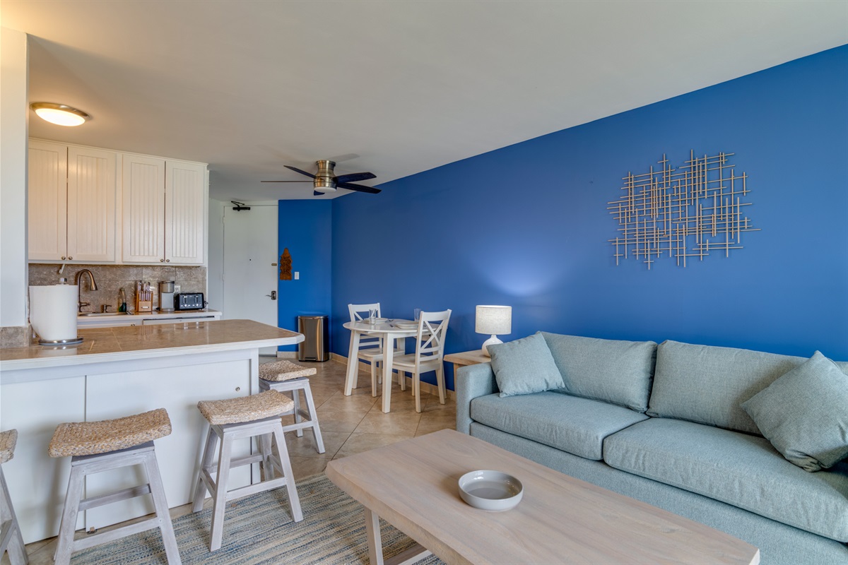 2 Bedrooms • 2 Bathrooms 2 Baths • Sleeps 3-6Welcome to our remodeled 2BR/2BA condo in Kauhale Makai – Village by the Sea, an oceanfront complex in sunny Kihei. You’re only a few steps from the shoreline, beautifully maintained grounds, and a full set of resort-style amenities.